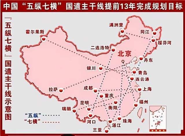 “五縱”指同江—三亞、北京—珠海、重慶—北海、北京—福州、二連浩特—河口。“七橫”指連云港—霍爾果斯、上?!啥?、上?!瘥悺⒑怅枴ッ?、青島—銀川、丹東—拉薩、綏芬河—滿洲里。